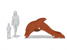 Bezúdržbová herní sestava ve tvaru delfína s výškou plošiny 80 cm. Sestava je vybavena stěnou s výřezy a skluzavkou se skluznicí z HDPE.