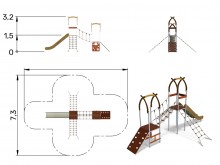 Konstrukce ze žárově zinkované oceli. Sestava je vyrobena z vodovzdorné překližkové desky z finské břízy s bezpečným zaoblením o poloměru 9 mm, na povrchovou úpravu jsou použity speciální ekologické čistě přírodní oleje a lazury. HDPE skluznice je zafrézována do bočnic ze stejného materiálu. Lanové prvky jsou tvořeny lany Ø 16 mm s ocelovou vložkou a nerozebíratelným spojením dle ČSN-EN 1176. Lano se skládá ze šesti točených, 2,5 mm silných ocelových pramenů, které jsou každý sestaven ze 7 jednotlivých, pozinkovaných drátů. Každý pramen je opláštěn cca 6 mm silnou a vysoce kvalitní polyesterovou přízí.