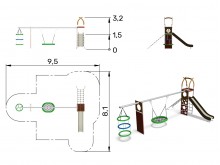 - 1x věž, 1x lanová síť svislá, 1x lanová síť šikmá, 2x stěna s kruhovými výřezy, 1x skluzavka, 1x houpačkové hnízdo, 1x kruhy na točení