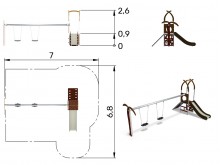 - 1x věž, 1x rampa s výřezy, 1x lezecká stěna s kruhovými výřezy, 1x žebřík, 1x skluzavka, 2x houpačky