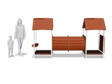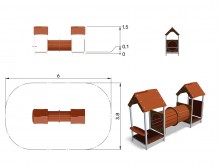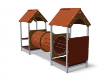 Věžičková sestava se dvěma věžičkami - domečky, které jsou spojeny prolézacím tunelem. Jedna věžička je vybavena stolečkem a druhá kreslící tabulí.
