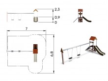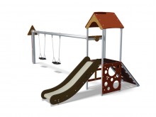 - 1x věž, 1x lezecká stěna s kruhovými výřezy, 1x žebřík, 1x rampa, 1x skluzavka, 2x houpačka